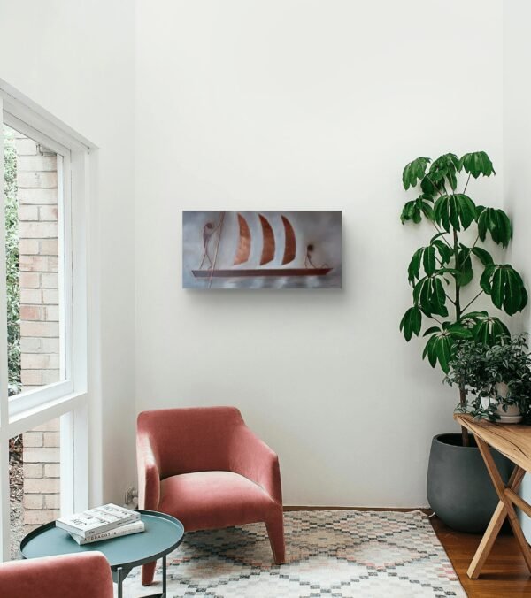Laissez-vous transporter vers un univers de quiétude et de sérénité. L’atmosphère apaisante de cette oeuvre incarne la simplicité et la beauté de l’instant présent. Glisser au fil de l’eau, savourer le silence, se laisser porter par les doux bruissements du vent dans les voiles… Un refuge de calme et de bien-être partagé pour ceux qui s’y attardent.