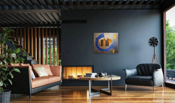 Tableau contemporain sur fond de sable collé. Motifs en cuivre. Dimensions: 50 x 60 cm. Peinture à l’huile.