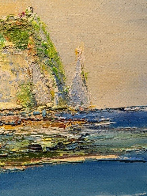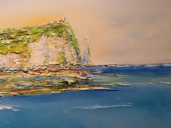 Étretat, un lieu emblématique de Normandie, où la mer et les falaises s’unissent dans une parfaite harmonie. Le regard posé sur cette toile invite à contempler l’immensité de l’horizon, s’élevant vers les cieux. La majesté des falaises et la puissance de la mer dégagent une sérénité profonde et une force tranquille, captivant celui qui l’observe. Cette toile insufflera une belle dynamique à la pièce, apportant une touche de grandeur et de calme.