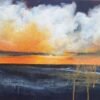 Ce tableau abstrait évoque des falaises qui déchirent les nuages. L’artiste utilise des vaporisations d’eau pour créer des coulées, laissant le hasard façonner l’œuvre.