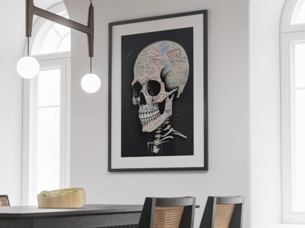 Cette œuvre fascinante utilise le crâne comme une métaphore visuelle pour représenter les pensées, idées et souvenirs. Des annotations et dessins délicats sur la surface du crâne révèlent une esthétique unique, mélangeant science et art. Parfaite pour des intérieurs modernes et intellectuels, cette pièce incarne la réflexion et la créativité.