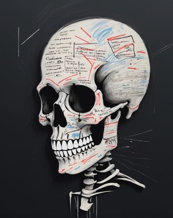 Une exploration artistique d’un crâne, symbolisant la pensée et la complexité de l’esprit humain.